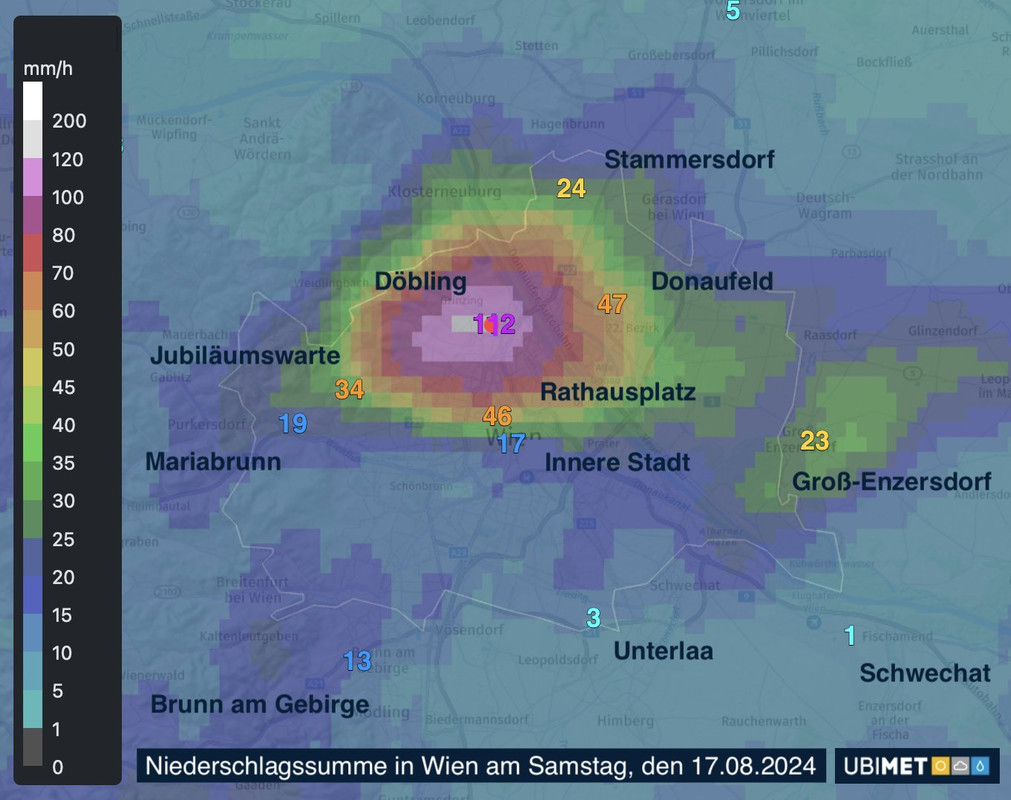 Noch höhere Raten gab es an der Hohen Warte am Dienstag mit 34,4 mm in 60 Minuten sowie am Donnerstag mit 22,8 mm/h. Unterlaa wurde dagegen am Mittwoch mit 18 mm/h erwischt.